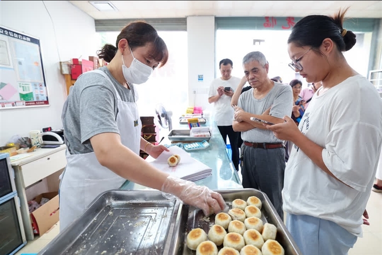 中秋临近,县城群益街一家老字号糕点店迎来销售高峰。店内月饼香气弥漫,等候购买的市民排起长龙,师傅们加班赶制苏式月饼。店主表示,近日月饼销量持续走高,日均销量达5000枚。