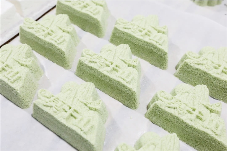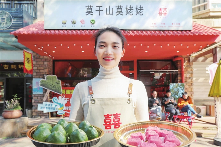 这家手工糕点坊今年7月开业,短短数月便成了庾村的“人气点位”。主理人汪敏娜不断推出桂花方糕、小桃子糕、粽子、青园子等十余款产品,更将艾草融入糕体,创新制作“莫干山糕”。竹签一插、图案一印,外形像极了“糕点冰棍”,深受年轻游客追捧。
