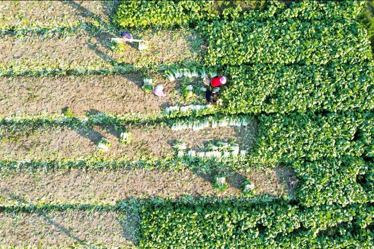 在姚家坞连片的白菜田里,几位村民正弯腰收割,手起刀落,一棵棵青白肥硕的长梗白菜应声倒下,随后被扎成捆,用扁担一担担挑往村中。村民谢小梅趁着劳作间隙,举起手机对准当天采到的一棵“白菜王”,打算发个朋友圈。“我家5亩白菜已经全部收完,正在腌着呢!”她说道,如今在种植大户的基地帮忙,既能为自家腌菜腾出时间,还能赚些“外快”。