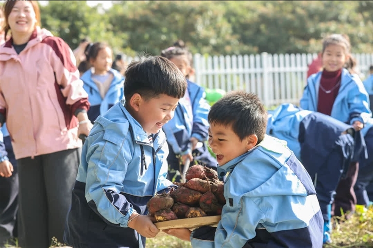 昨天,雷甸镇第二幼儿园的农耕基地里,小孩子们挖番薯、拔蔬菜、采收甘蔗,近距离接触农耕文化,感受丰收的喜悦。