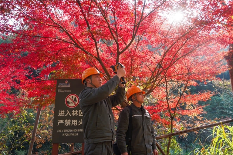 近日,莫干山风景区层林尽染,红枫进入最佳观赏期,游客络绎不绝。国网德清县供电公司组织工作人员通过“人巡+机巡”相结合的方式,及时掌握山区主要供电线路运行状况,为景区赏枫季用电安全提供坚实保障。