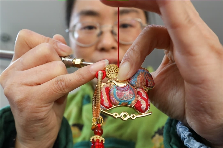 自2025年11月起,这样的工作占据了她每天大部分时间——为即将到来的马年,赶制一批又一批手工宋锦挂件。