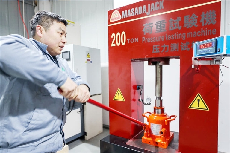 “对于千斤顶而言,它承载的往往不只是设备,更是人员的安全和工程的进度。”公司总经理方定介绍,产品的核心竞争力并非单纯的“能顶多重”,更在于“长期稳定可靠”。以桥梁、轨道交通等项目为例,其单体构件重量通常在20~100吨之间,实际施工多为多台千斤顶同步作业,单台承载约40~70吨。为保障项目质量,顶升过程往往需要反复顶起、保压、微调和回落,单台千斤顶在一项工程中常需工作几十次甚至上百次。为此,在产品测试中,不仅要求千斤顶在常用负载范围内保持长期稳定工作,还需能够承受高频次的反复起顶作业。