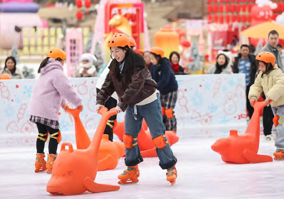 2月17日,大年初一,市民在下渚湖·奇幻谷景区户外冰场游玩(上左图)。