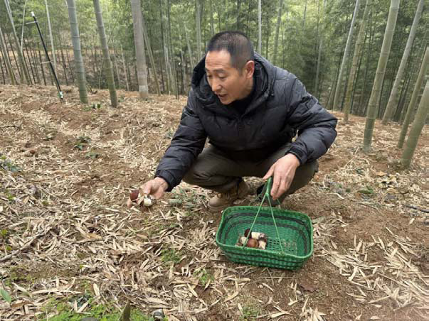 近日,记者来到位于北湖村的锦禾生态农业基地,只见竹林地表覆土松软,一朵朵褐顶白颈的蘑菇已经破土而出。基地负责人沈伟梁小心翼翼地拨开腐殖土,将褐色的“小伞”——褐松茸轻轻采下,放入竹篮。“今年褐松茸的长势特别好,个头比往年更大,产量也有明显提升,预计每亩产量可达到750公斤以上。”沈伟梁介绍,这是他种植褐松茸的第三年,种植区占地约10亩。随着气温逐渐回升,褐松茸已进入开采期,预计4月将迎来大批量成熟。